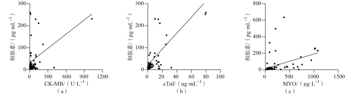 Objective To investigate the role of serum copeptin in the early diagnosis and prognosis assessment of acute myocardial infarction (AMI). Methods A total of 102 AMI patients(AMI group)and 55 non-AMI patients(control group)from the First Affiliated Hospital of Hunan University of Chinese Medicine from January 2023 to January 2024 were enrolled. The clinical data were collected,and serum copeptin,creatine kinase MB isoenzyme(CK-MB),cardiac troponin(cTn)I,myoglobin(MYO) and blood lipid levels were determined. Receiver operating characteristic(ROC)curve was used to evaluate the efficacy of each index in diagnosing AMI and predicting major adverse cardiovascular events(MACE)within 6 months. Spearman correlation analysis was used to assess the correlation between serum copeptin and CK-MB,cTnI and MYO in AMI patients. Cox proportional hazard regression analysis was used to evaluate the relationship between each indicator and the occurrence of MACE in AMI patients. Results The levels of serum copeptin,CK-MB,MYO and cTnI in AMI group were higher than those in control group(P<0.001). Serum copeptin was positively correlated with cTnI and MYO levels(r values were 0.578 and 0.624,respectively,P<0.001),but not with CK-MB(r=0.158,p=0.113). The area under curve(AUC)of serum copeptin for diagnosing AMI was 0.896,and that for predicting MACE within 6 months in AMI patients was 0.810. The AUC of copeptin+cTnI,CK-MB+MYO+cTnI and the combined determination of the 4 indicators for diagnosing AMI were 0.960,0.975 and 0.986,respectively,and those for predicting MACE within 6 months in AMI patients were 0.961,0.958 and 0.949,respectively. Serum copeptin,MYO and cTnI were risk factors for MACE within 6 months in AMI patients [hazard ratios(HR)were 1.005,1.004 and 1.070,95% confidence intervals(CI)were 1.001-1.008,1.000-1.008 and 1.015-1.128,respectively]. Conclusions Serum copeptin has high efficacy in the diagnosis of AMI and the prediction of MACE within 6 months,and it may be used as a biomarker for the early diagnosis and prognosis assessment of AMI.
