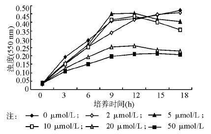 取一细胞培养板, 在每孔加入10 μ L大肠埃希菌DH5α 培养物(已稀释至106 cfu/mL, 稀释液为10% LB液体培养基)和90 μ L含不同浓度PNA、肽-PNA或四环素的10% LB液体培养基(PNA和肽-PNA最终浓度分别为0、2、5、10、20和50 μ mol/L, 四环素最终浓度分别为0、1、2、3、4和5 μ mol/L)。混匀后, 于550 nm测定吸光度值。然后封闭培养板, 37 ℃, 200 r/min(离心半径为5 cm), 培养。于培养的3、6、9、12、15和18 h分别测定吸光度值。
