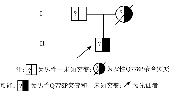 1. 先证者 男, 6岁, 自幼有皮肤瘀斑史, 躯干及下肢内侧经常有自发性出血点和淤青。本次因鼻衄10 d, 伴黑便, 发热39 ℃就诊, 曾输用药物止血敏、冷沉淀物、凝血酶、维生素C、维生素K、血浆等, 均未达到止血效果, 就诊后鼻腔填塞压迫止血。患者父母为非近亲婚配, 母亲因病出血感染而死亡。家系图见图1。家系标本的采集均经受试者或其监护人知情同意。