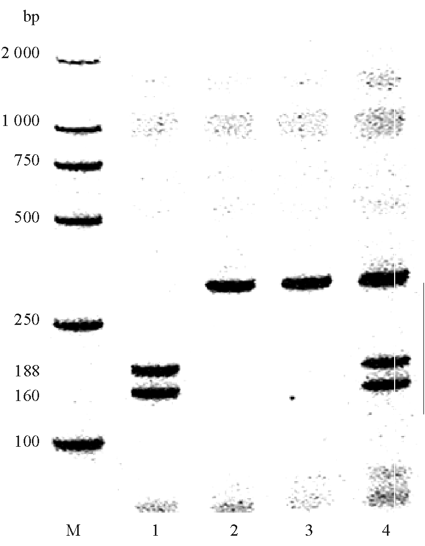 PCR反应总体积为25 μ L, 其中包含10× PCR缓冲液2.5 μ L, 25 mmol/L dNTP 0.2 μ L, 50 μ mol/L上游引物、下游引物各0.2 μ L, DNA 200 ng, Taq DNA聚合酶1 U, 用去离子蒸馏水补至25 μ L。扩增循环参数:94 ℃ 预变性5 min, 再按94 ℃变性 40 s、60 ℃退火 40 s、72 ℃延伸 90 s共35次循环, 最后72 ℃ 扩增延伸5 min。