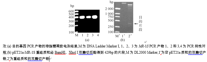 MR-1S基因通过PCR扩增后, 产物经琼脂糖凝胶电泳, 片段大小为429 bp, 见图1(a)。与pUCm-T载体连接、转化, 阳性克隆送测序, 结果显示该重组质粒已插入的MR-1S序列完全正确。经BamHI、Xhol I双酶切、回收目的DNA片段, 与同样双酶切的pET21a连接, 转化DH5α , 扩菌后提取重组质粒, 双酶切后能得到400 bp左右的片段, 条带与预期一致, 见图1(b)。