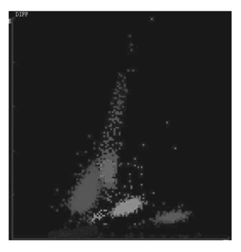 本院血常规检测使用Sysmex XS-800i五分类全自动血液分析仪应用了半导体激光流式细胞原理结合细胞化学荧光染色技术对血细胞进行检测, 通过半导体激光照射被检细胞内部, 如核和颗粒, 侧向荧光反映细胞内DNA和RNA的含量, 提高了细胞分析的准确度和灵敏度, 并用散点图(X轴表示侧向荧光的强度, Y轴表示侧向散射光的强度)和直方图直观表示。若淋巴细胞越幼稚、核越大; 越幼稚、细胞浆越少, 浆内的RNA/DNA含量则越高; 代谢越强, RNA染色越深, 荧光越强。故正常淋巴细胞常集中在散点图的左下角(见图1)。而在异常淋巴细胞即幼稚或原始淋巴细胞产生时, 细胞的大小、核结构及胞内颗粒均发生了不同程度的改变, 以至于外周血细胞散点图上出现淋巴细胞群“ 拖尾” 的现象(见图2)。由图可见患儿血细胞检测散点图的特殊排列明显异于正常图形:异常淋巴细胞集中在图形的上部1/2处, 细胞体积明显大于正常淋巴细胞, 荧光强度也较正常淋巴细胞略强。跟踪调查符合条件患者的散点图发现:该特异的散点图形具有一定的共通性, 且对症治疗后, 患者图形明显趋于正常(见图3), 异常淋巴细胞群逐渐消失。可见散点图的分布对EBV病毒的急性感染诊断有较重要的辅助意义。若在日常血常规检测中及时发现存在相关特异散点图形的患儿, 可提示临床EB病毒的感染相对风险, 对病毒感染的早期发现和及时对症治疗有一定的帮助。