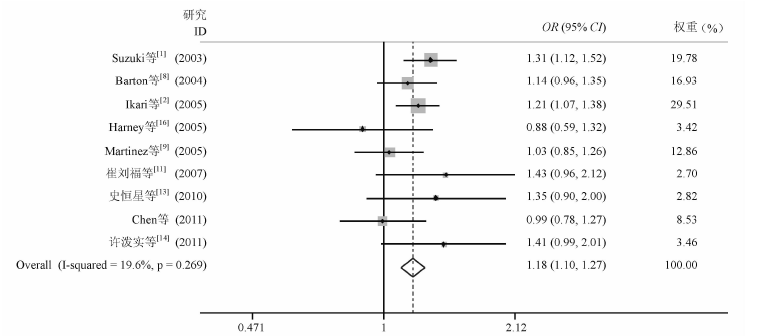 Meta分析方法[19]是在1976年由Glass首次提出, 用于对具有相同研究目的多个独立研究结果进行系统分析、定量综合的一种研究方法。随着循证医学的发展, 一个可靠的研究结论的得出, 已不再简单地局限为一两个研究结果和一种统计分析方法, 而是依靠对具有相同研究目的的多个研究结果进行综合定量分析和系统性的评价。Meta分析在检验研究对象及相关风险因素的异质性基础上, 采用不同的模型对各研究结果进行统计合并, 扩大了样本含量, 增加了统计学检验功效, 改进了对研究效应的估计。与单项研究相比, 综合研究所得出的结论更全面更可靠。同时经发表偏倚评估和剪补分析进一步完善分析资料的全面性和可靠性, 使所得出的结论更加接近于真实。