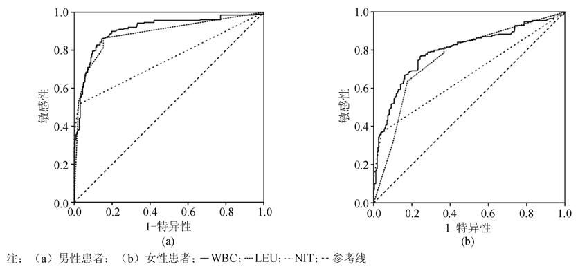 本研究结果显示尿常规检测快速、简便, WBC、LEU、NIT联合分析具有良好的敏感性及特异性, 适用于尿路感染, 特别是男性患者的早期诊断和筛查。对于就诊前已使用抗菌药物的患者, 尿培养阳性率明显降低[15], 而尿常规除药物的抗菌作用使结果转阴, 还应注意呋喃坦啶可使LEU出现假阳性, 头孢菌素、庆大霉素可使LEU出现假阴性[16]。故对于已使用抗菌药物的患者应注意询问抗菌药物类别并参考WBC及NIT结果。临床医师可以根据尿常规的结果选用抗菌药物对患者进行经验治疗。但尿常规只能早期提示尿路感染, 无法检测病原菌并提供药物敏感性结果, 同时存在一定的假阴性, 故对怀疑尿路感染的患者需同时进行中段尿培养, 并且根据药物敏感性试验结果进行抗菌药物的调整。本研究受样本量限制, 未对患者进行年龄分层, 研究尿常规对不同年龄段尿路感染患者或不同病原菌感染患者的诊断价值。反复尿路感染患者因长期使用各种抗菌药物, 同时多伴有基础疾病, 会对尿常规结果造成影响[10, 14]。本研究未进一步细分尿常规对初发尿路感染患者及反复尿路感染患者的诊断价值。后续研究会扩大样本量并对患者进行细分, 探讨尿常规对不同患者的诊断价值。
